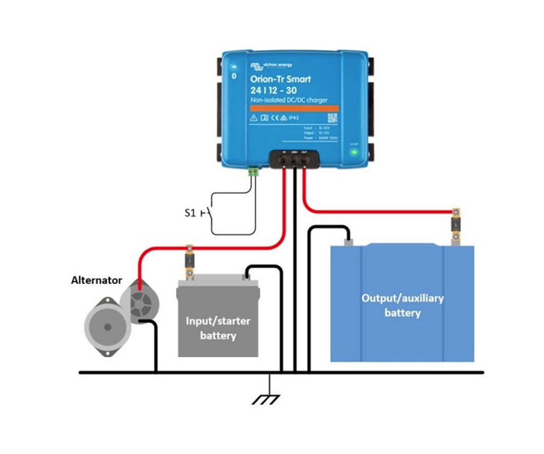 For eksempel et 12VDC start- eller forbrugsbatteri i et 24VDC system.