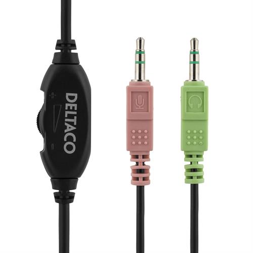 DELTACO headset med mikrofon, volumenkontrol på kablet, 2×3,5mm, 2m kabel, sort