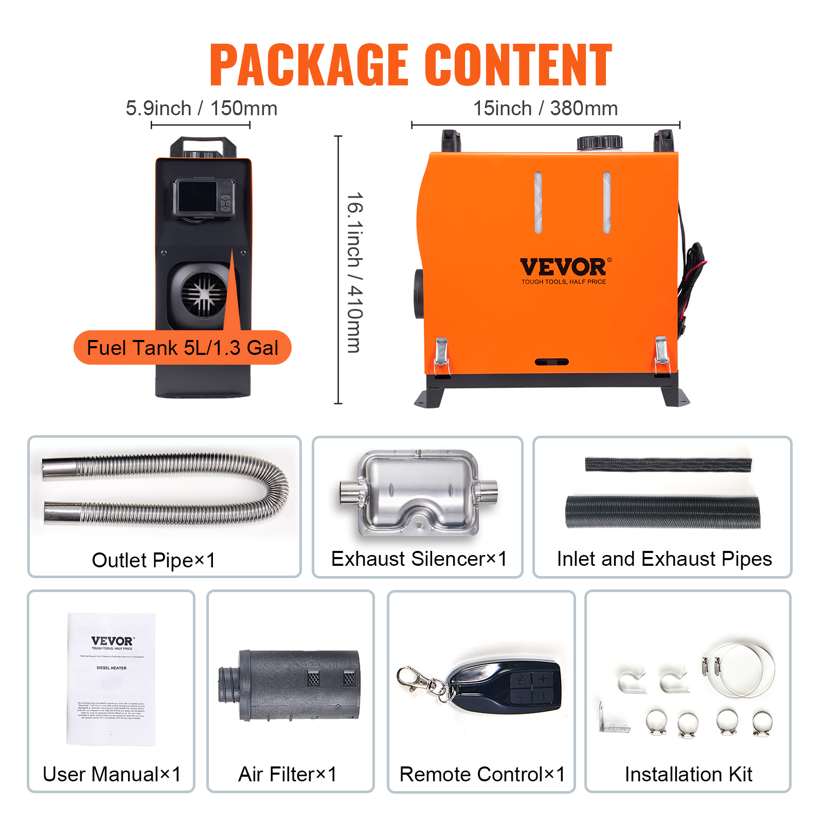 VEVOR dieselluftvarmeren er ideel til en solid og enkel transportabel varmeovn. Det er fantastisk til at holde varmen i din bil, båd eller hytte eller mens du camperer udenfor. Denne varmelegeme bruger dieselolie, som er let tilgængeligt. Der er ikke behov for nogen speciel opsætning til denne varmelegeme. Du skal blot pakke den ud, tilslutte den, og den vil straks give varme.