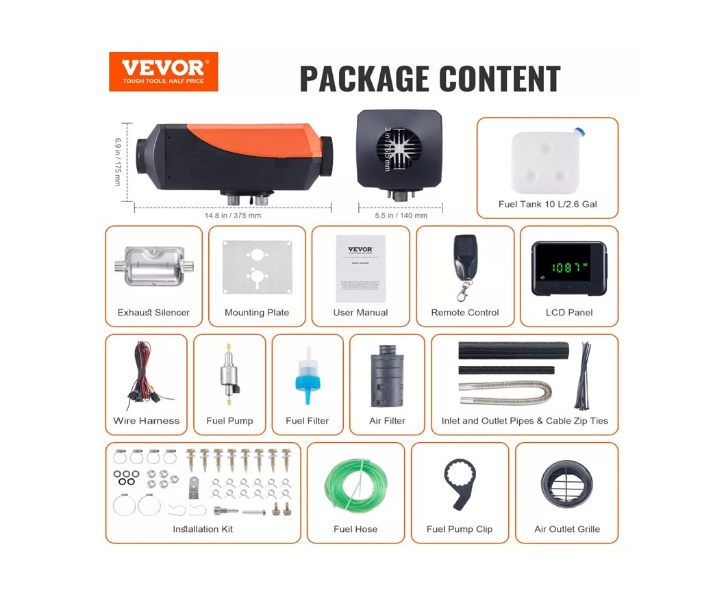1 x Diesel varmer 1 x Oliepumpe 1 x 10L brændstoftank 1 x LCD-switch 1 x Fjernbetjening 1 x Lyddæmper 1 x Oliefilter 1 x Luftfilter 1 x Luftindtagsrør 1 x Luftudtagsrør 1 x Udstødningsrør 1 x Brændstof slange 1 x Monteringsplade 1 x Udluftning 1 x Oliepumpe Holder 1 x Ledningsnet 1 x Installationssæt 1 x Engelsk Manual