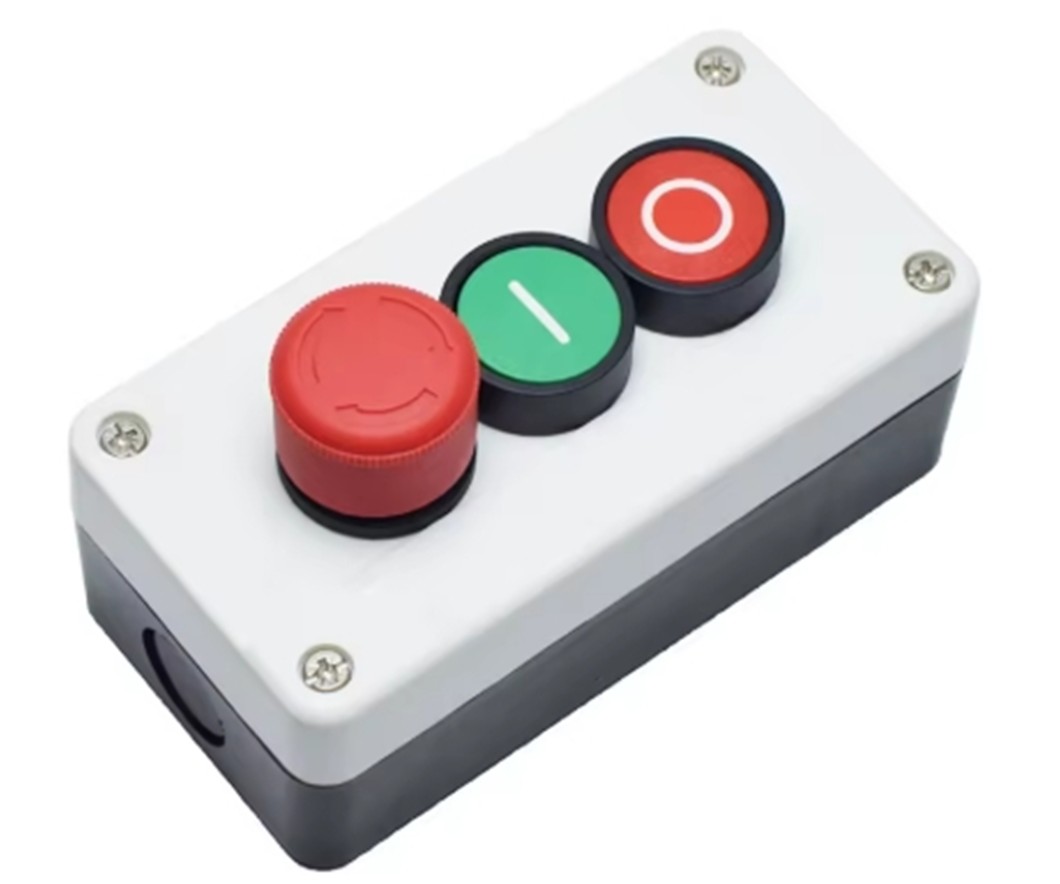 Grøn knap (I):Enmomentanknap (fjedrende retur), der bruges til at starte en maskine eller proces. Den bruger en1 NO(Normalt Åben) kontakt.